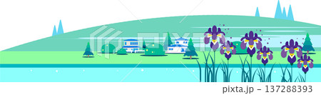 初夏の風景、菖蒲の花と住宅街が広がる緑豊かな丘のフラットイラスト