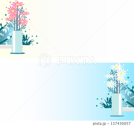 花瓶に生けられたマーガレットのフレームセット(ピンクと白のバナー背景)