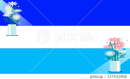 青と白の3段背景に飾られた白いマーガレットとピンクのデイジーのフラットイラスト