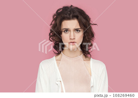 Portrait of sad worried woman with curly hair wearing casual style outfit having problems, looking at camera with unhappy expression. Indoor studio shot isolated on pink background.
