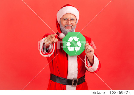 Satisfied positive elderly man with gray beard wearing santa claus costume pointing to camera with finger, showing green recycling sign. Indoor studio shot isolated on red background.