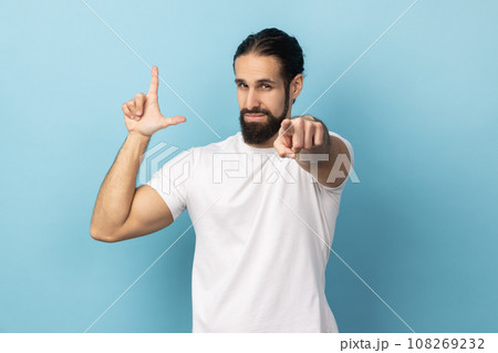 Portrait of frustrated man with beard wearing white T-shirt showing looser gesture and pointing at camera, looking with grumpy face. Indoor studio shot isolated on blue background.