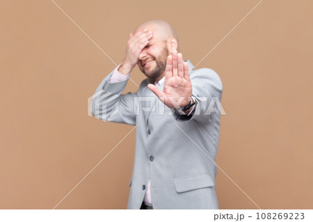 Portrait of scared frighten bald bearded man covering his face and showing stop hand gesture, sees something shameful, wearing gray jacket. Indoor studio shot isolated on brown background.