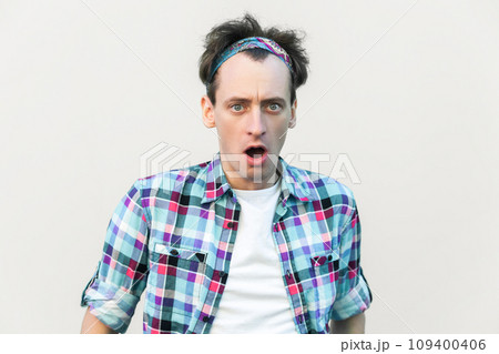 Stupefied man looks with astonishment at camera, being amazed with negative news, does not believe his eyes, wearing checkered shirt and headband. Indoor studio shot isolated on gray background.