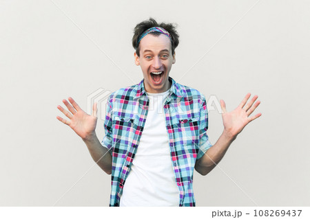 Surprised attractive man keeps jaw dropped and eyes widely opened, has rapt attention, raised his arms, wearing blue checkered shirt and headband. Indoor studio shot isolated on gray background.