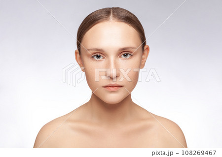 Closeup portrait of beautiful attractive serious woman with perfect skin looking at camera standing with bare shoulders. Indoor studio shot isolated over gray background.
