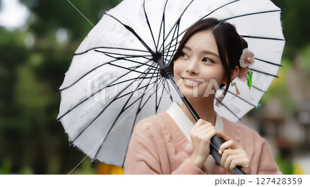 桜の木の下に立つ傘を持った着物の女性