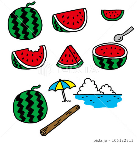 いろんな切り方のスイカのイラストとスイカ割の挿絵
