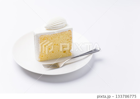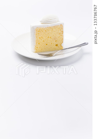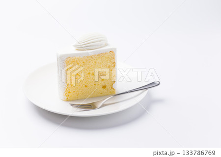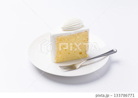 皿に盛られたケーキ シフォンケーキ 白背景