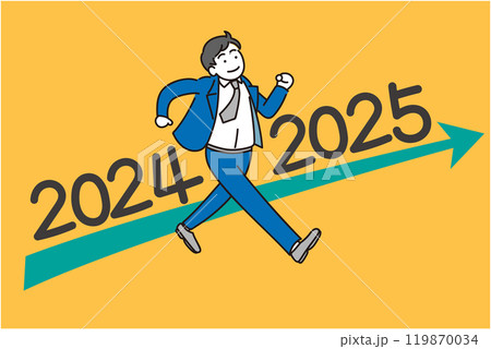 2024年から2025年へビジネスマンが元気よく歩いていくイラスト