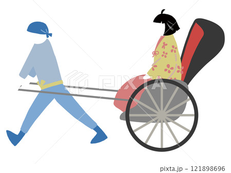 人力車に乗った日本の和服着物を着た女性と、人力車を引っ張る男性のイラスト