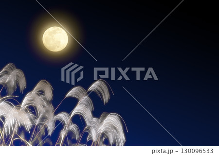 秋の夜空に白色の満月とススキ。お月見イメージ素材