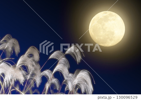 秋のお月見イメージ。中秋の名月の満月とススキ