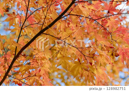 赤色やオレンジに紅葉した秋のカエデの葉と青空