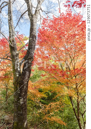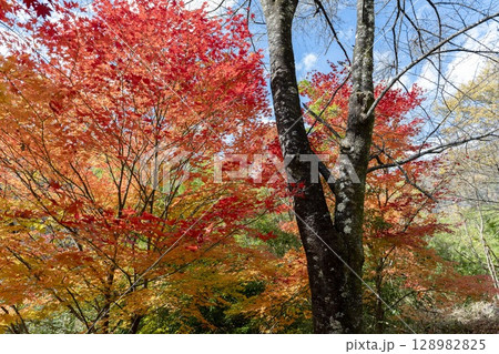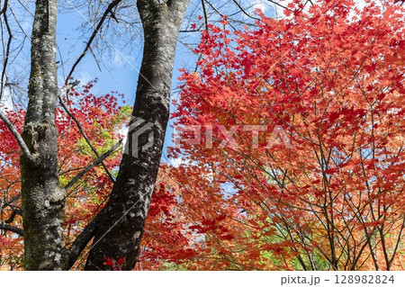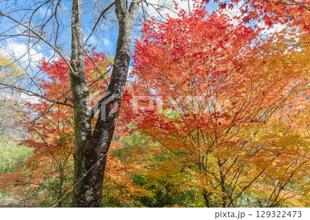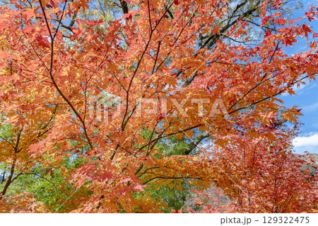 鮮やかな赤色に紅葉したモミジの木と秋の風景