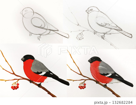 Bullfinch drawing tutorial steps. Red bird painting sketch. Art education illustration design creativity. Light background tutorial step-by-step