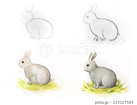 Rabbit drawing tutorial illustration. Bunny sketch painting step-by-step masterclass. Art education crafts children Easter. Watercolor style white background
