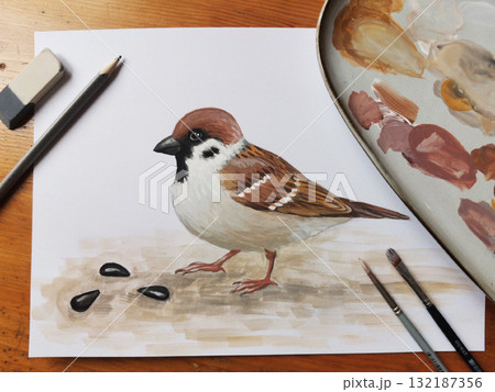 Sparrow bird painting artwork. Bird illustration ornithology wildlife drawing. Gouache learning nature education art supplies. White background brown tone illustration