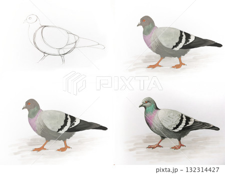 Drawing pigeon step by step instruction. Painting bird art tutorial guide. Sketch education hobby illustration design. Watercolor style white background