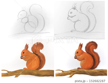 Squirrel drawing tutorial illustration. Step by step guide depicting animal art. Education wildlife nature creation. Artistic expressive style orange white background