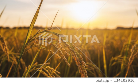 夕日に照らされる稲穂