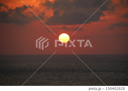 水平線に昇る朝日とオレンジ色の朝焼け空
