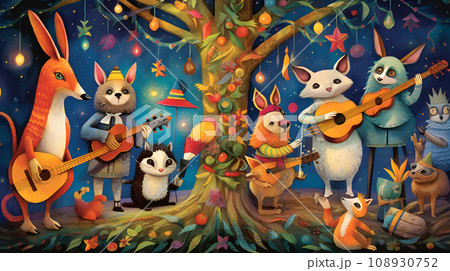 おとぎ話のような架空の動物たちの楽しそうなパーティ ごちそう AI生成画像