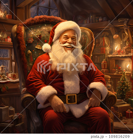 子どもたちへのプレゼントを考えるおじいさんサンタクロース AI生成画像