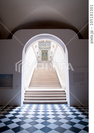 ヴェルサイユ宮殿のアーチと階段と白黒のモザイクタイル
