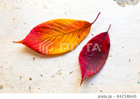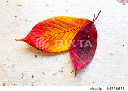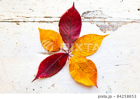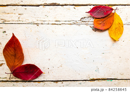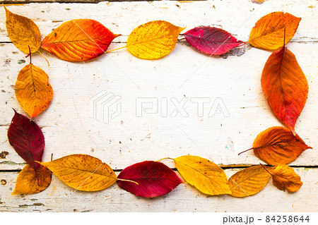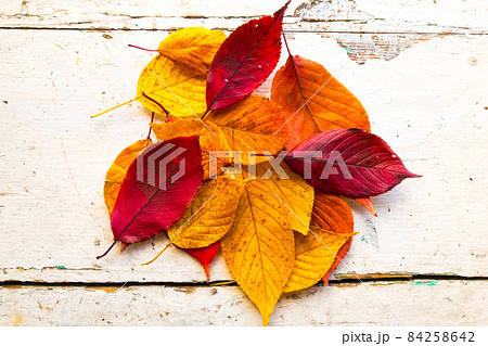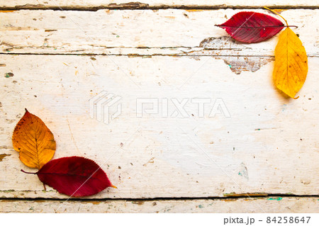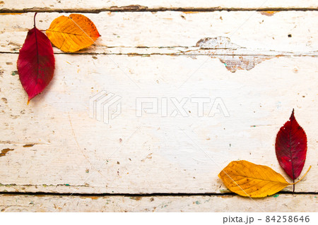 秋、紅葉した落ち葉とシャビーシックなビンテージアンティークの白いテーブル