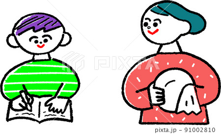 勉強する男の子と家事をする母親のおしゃれな親子のイラスト