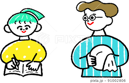 勉強する女の子と家事をする主夫のおしゃれな親子のイラスト