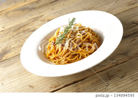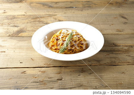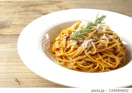 粉チーズとローズマリーの乗ったスパゲッティミートソースを白背景で撮影