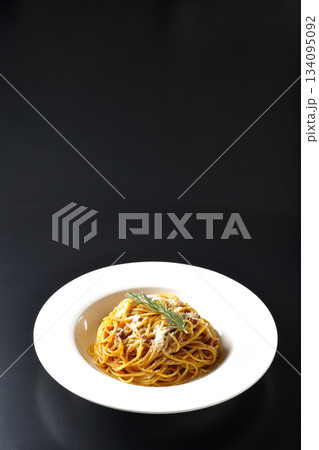粉チーズとローズマリーの乗ったスパゲッティミートソースを黒背景で撮影