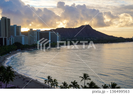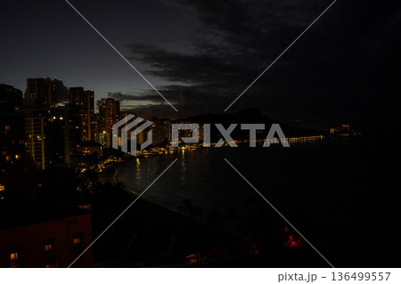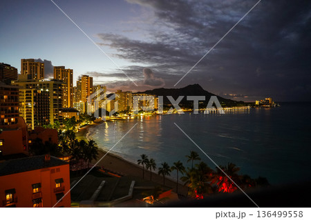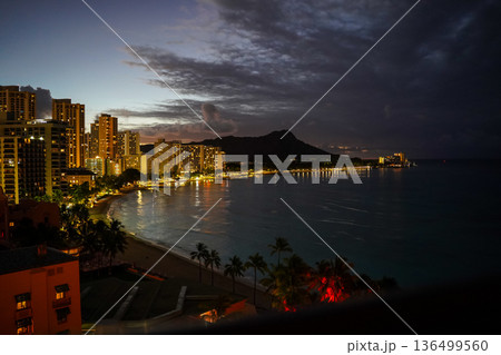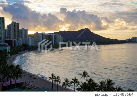 ハワイ シェラトンワイキキから望む ワイキキビーチとダイヤモンドヘッドの夜明け
