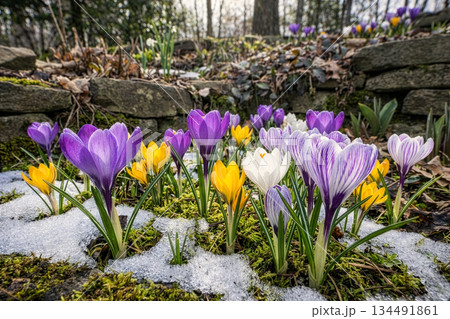 春の訪れ、雪の残る庭に咲くクロッカス