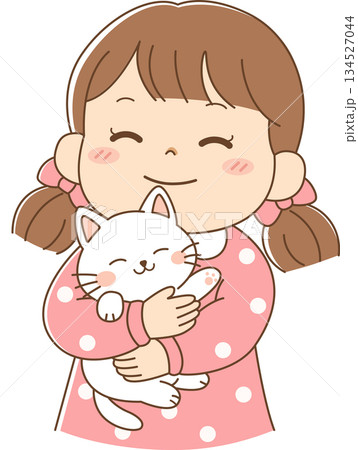 猫を抱きしめるかわいい女の子のほのぼのイラスト
