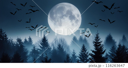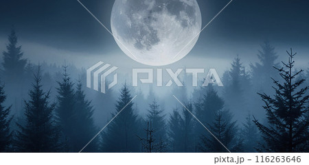 霧でかすみがかった薄暗い森のパノラマイメージ