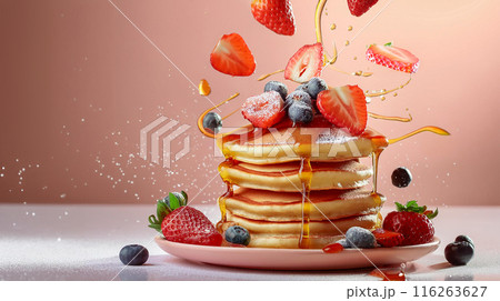 躍動感あるカラフルなフルーツパンケーキのイメージ
