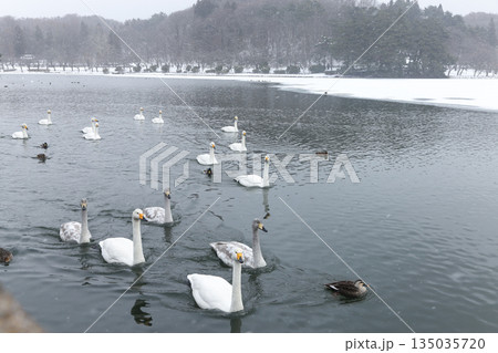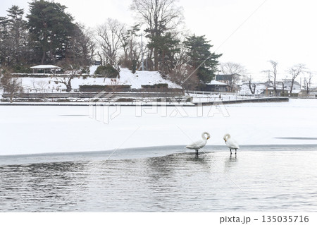 凍結した湖に浮かぶ白鳥