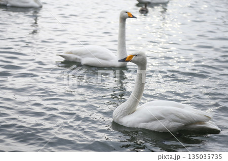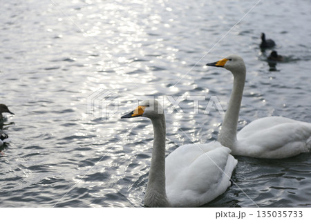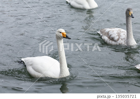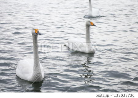 凍結した湖に浮かぶオオハクチョウ