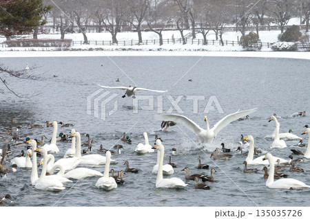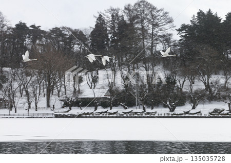 雪の積もった公園に飛ぶ白鳥
