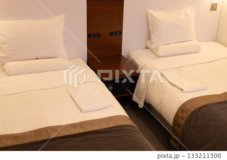 夜のホテルのツインルーム