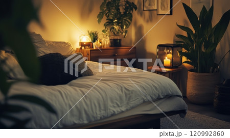 A Cozy Bedroom at Night Featuring Beautiful Plants and Soft, Warm Lighting for Comfort