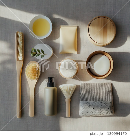 Aesthetic flat lay of natural skincare and oral hygiene products, beautifully arranged