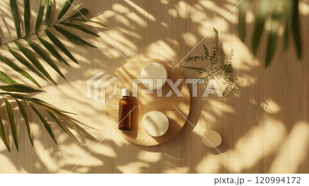 Natural Skincare Products Displayed Elegantly on a Wooden Surface Surrounded by Greenery