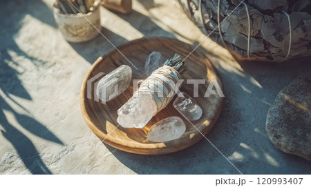 Natural Crystals arranged beautifully on a Wooden Plate illuminated by warm Sunlight