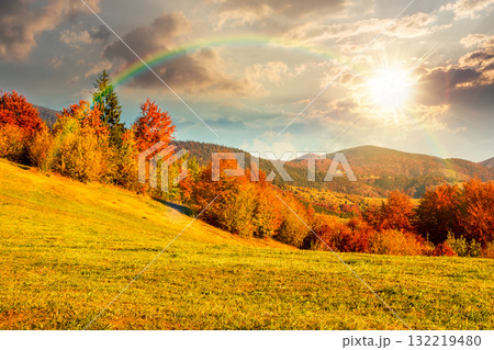 sunny autumn in mountain landscape at sunset. beautiful view of trees in fall foliage on the hillside. alps of countryside in evening light under blue sky. scenery with forest on slope under rainbow