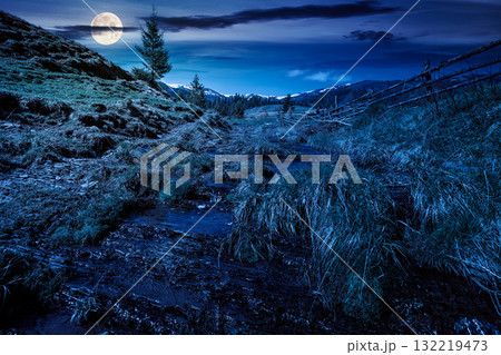 rural area of mountains in autumn at night. wonderful highland in full moon light observed from the hillside. meadows on rolling hills near spruce forest. alpine travel destination
