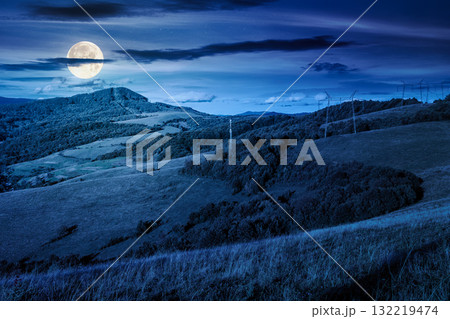 rural scene of mountain landscape in spring at night. mysterious countryside with forested hills in full moon light. beautiful valley sustainable development under sky with dark clouds